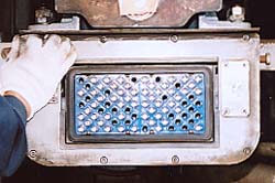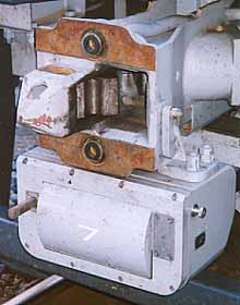 | 電気連結器内部 KE154との大きな違いは,写真からも判るように,接触子が減芯されていることと,一部に金メッキ接触子が使われていることです。本来82芯のところ28芯減芯の54芯で使用されています。(写真で黒く写っている部分が,接触子を抜いて減芯した部分) |
